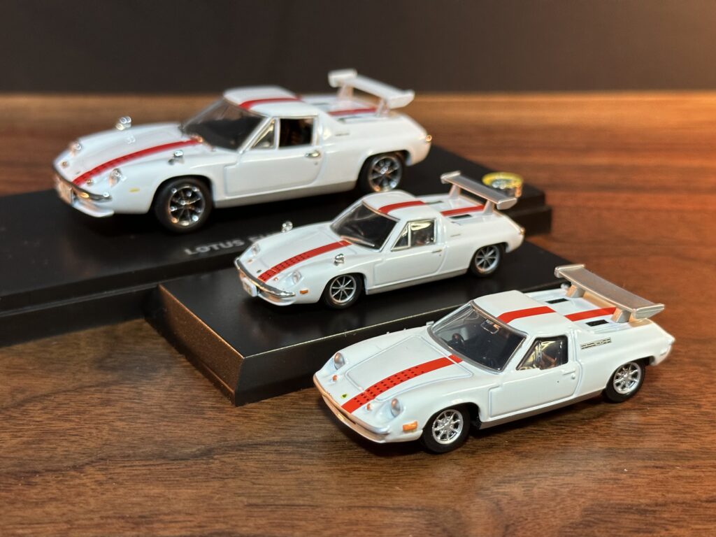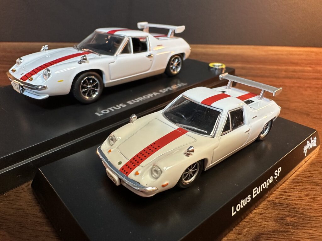 下の写真、右側手前、京商から発売された ロータスヨーロッパ スペシャル (ホワイト) サーキットの狼 スケール1/64。
