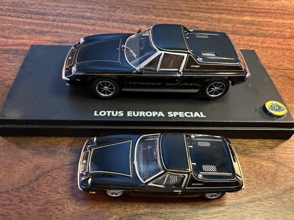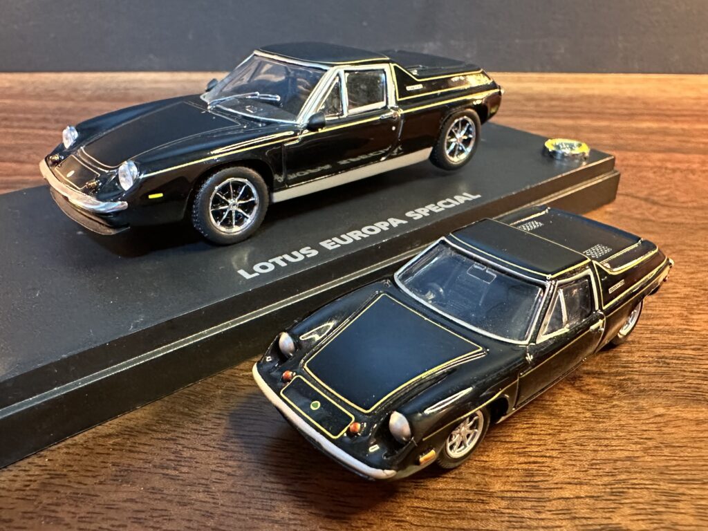 京商から発売された ロータスヨーロッパ スペシャル JPS仕様 スケール1/43(奥)とトミーから発売された ロータスヨーロッパ スペシャル JPS仕様 スケール1/59(手前)です。ちなみにカラーリング以外でサーキットの狼仕様との大きな差は、サイドミラーがフェンダーミラーからドアミラーになっています。