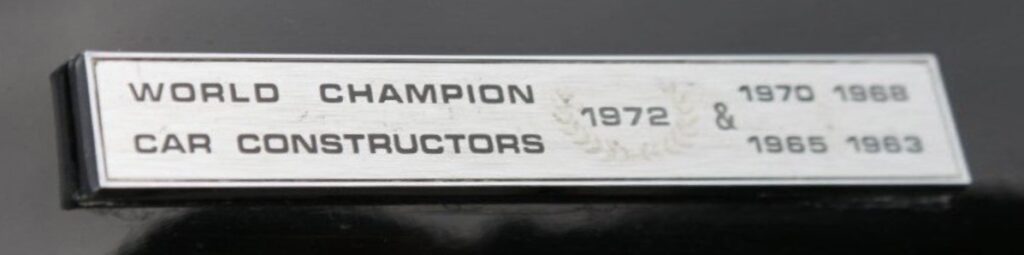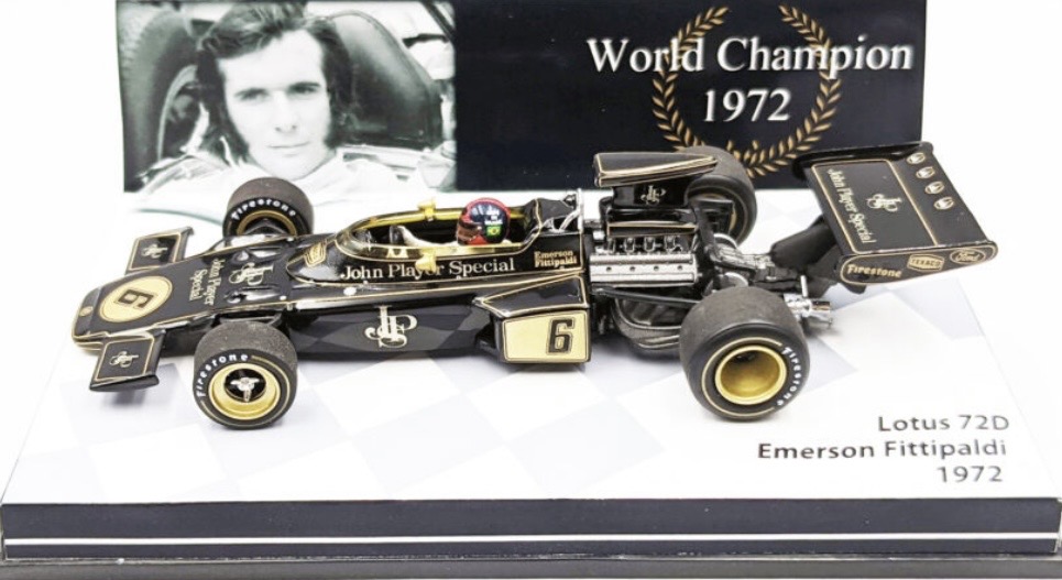 1972年 F1「チーム・ロータス」のメインスポンサーであったタバコブランド「JPS」のカラーリング(黒地に金のピンストライプ)をまとったロータス72Dが、ワールドチャンピオンに輝き、チーム・ロータスにコンストラクターズ・タイトルを獲得しました。