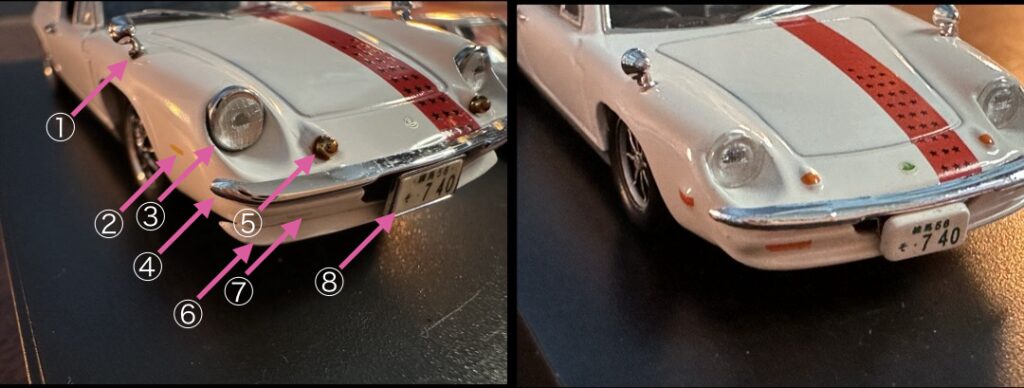 7 ウィンカー(バンパー下):両方ともオレンジ色が塗ってあるのみですが、1/43の方が薄い色で小さいです。