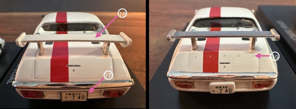 17 リアナンバープレート:どちらも別パーツですが、1/43の方が綺麗に再現されています。