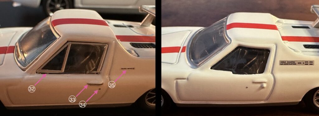 33 ドアハンドル: 1/64はドアハンドル風に膨らんだ形状に、シルバーで塗装されています。1/59は、膨らんだ形状のみです。