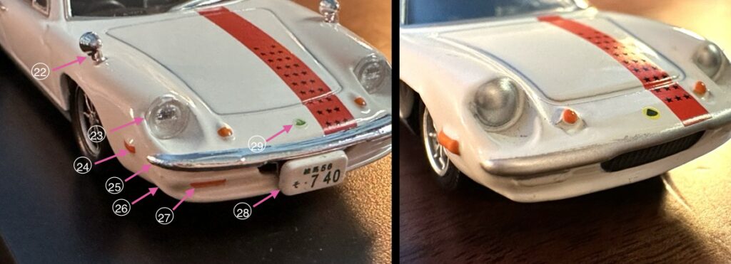 27 ウィンカー(バンパー下):1/64はオレンジ色が塗ってありますが、1/59はありません。