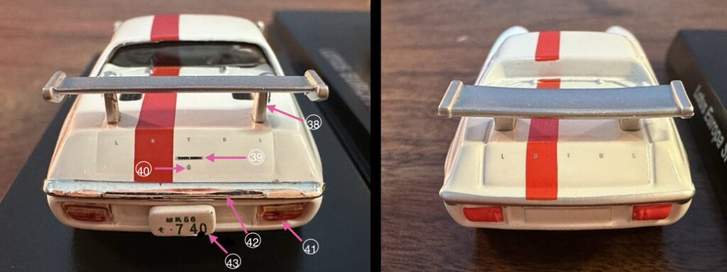 39 リア エンブレム: 両方とも、LOTUSのレターエンブレムがあります。1/64は、加えてスクリプトバッジの Europa Specialが再現されています。