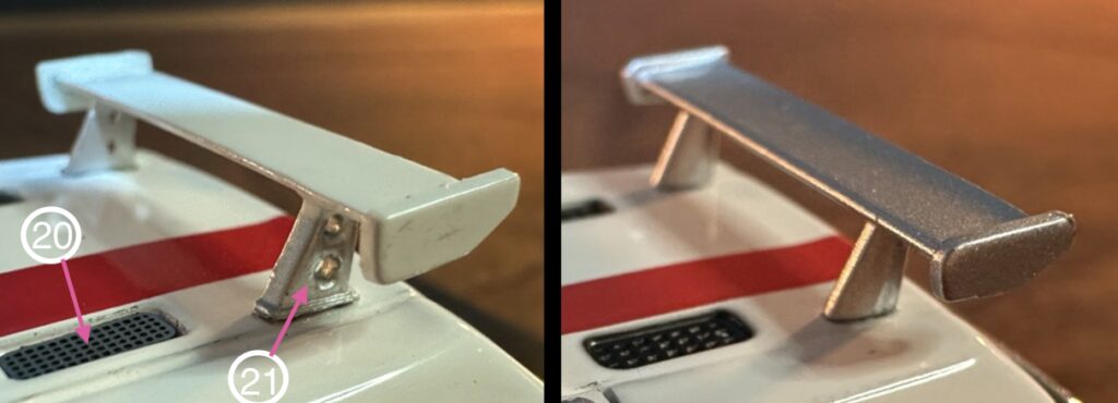 21 リアウィングステイ: 1/43は軽量化の穴が再現されています。