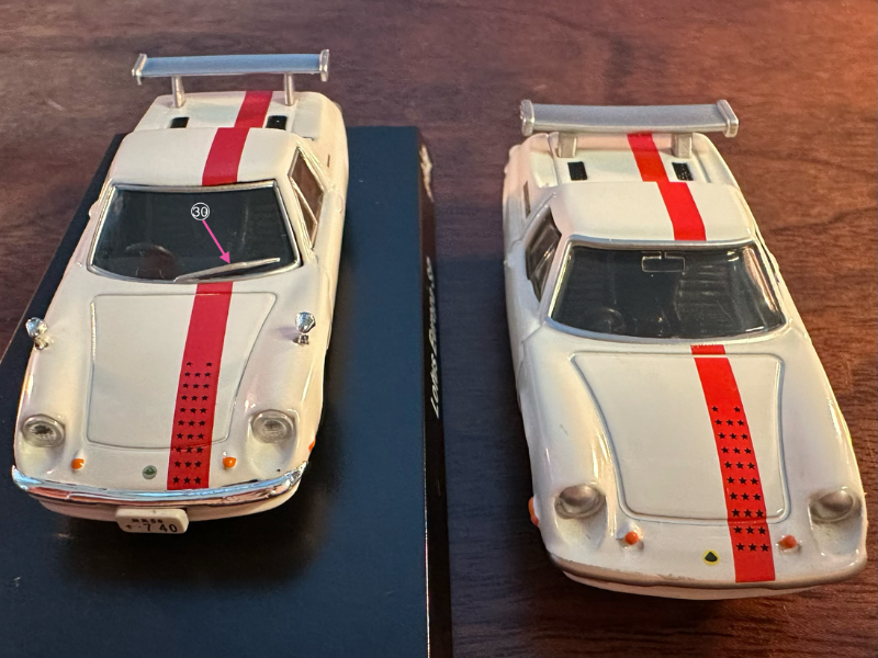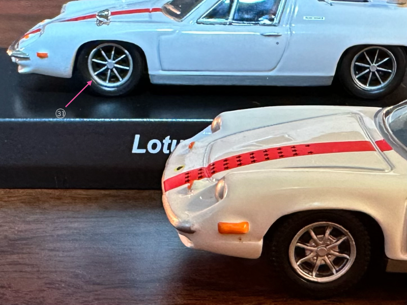 ロータスヨーロッパ スペシャル (ホワイト)サーキットの狼 京商のスケール1/64 とトミーのスケール1/59を、まじまじと比較してみました。数字が振ってある側が、スケール1/64 です。